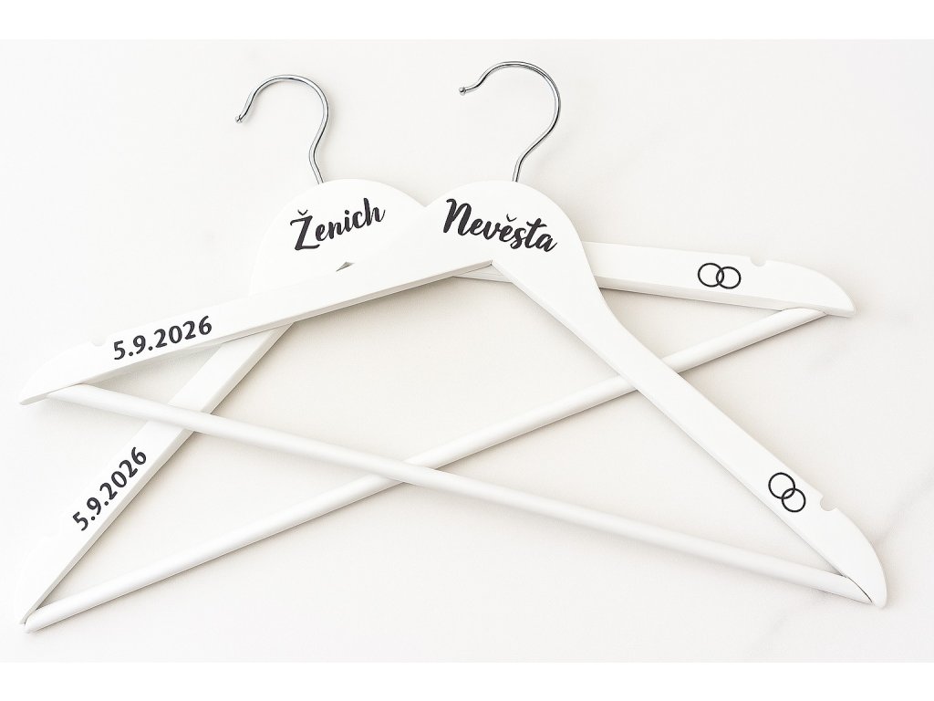 Každé ramínko je označeno jménem „Ženich“ nebo „Nevěsta“, doplněno svatebním datem a decentním motivem snubních prstýnků.