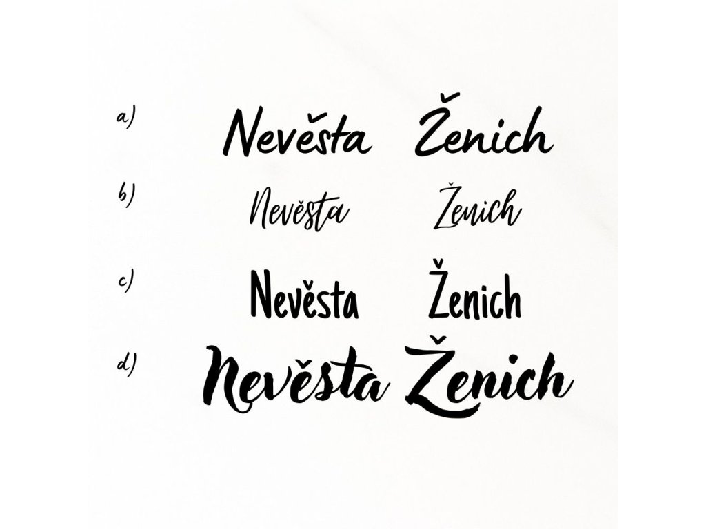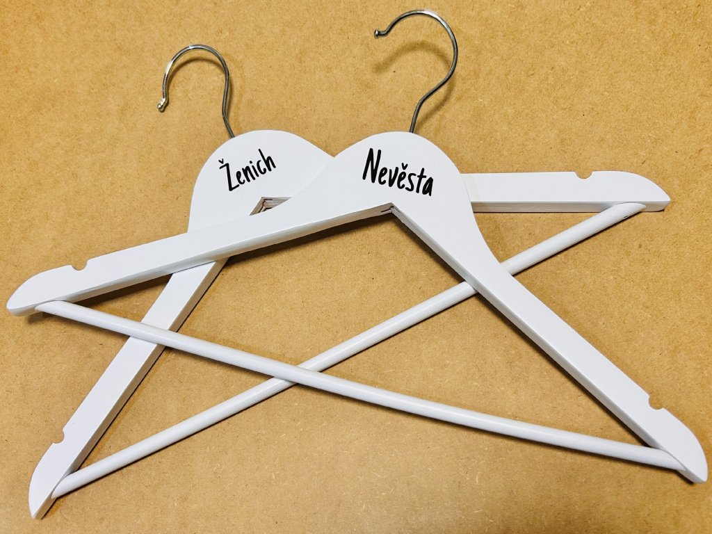 Ramínka mají čistý bílý povrch, černý decentní nápis a kovový háček, díky čemuž působí moderně a nadčasově. Hodí se ke svatebním šatům, obleku i dalším doplňkům.