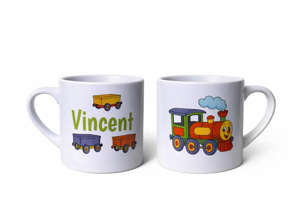 Barevná ilustrace lokomotivy nebo vagonků v kombinaci s personalizací jménem dodává hrnečku osobní kouzlo, které potěší každé dítě.