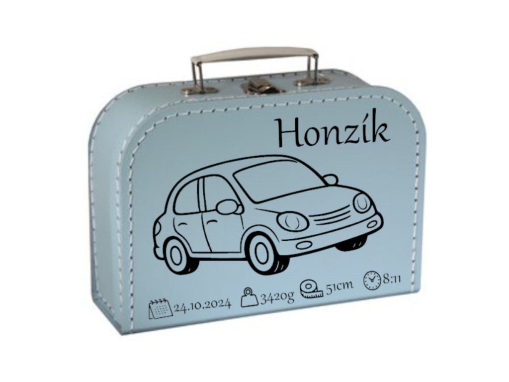 Hledáte originální a praktický dárek k narození dítěte? Tento modrý kufřík s ilustrací autíčka a personalizovanými údaji o narození je nejen krásnou památkou, ale i užitečným pomocníkem na cestách, do školky nebo na uschování pokladů.