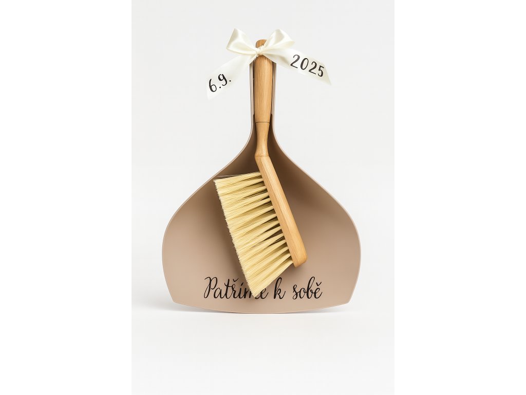Dřevěný smetáček s přírodními štětinami je ozdoben elegantní saténovou stuhou s datem svatby. Lopatka nese nápis „Patříme k sobě“ – jemné vyznání, které potěší novomanžele i svatební hosty.