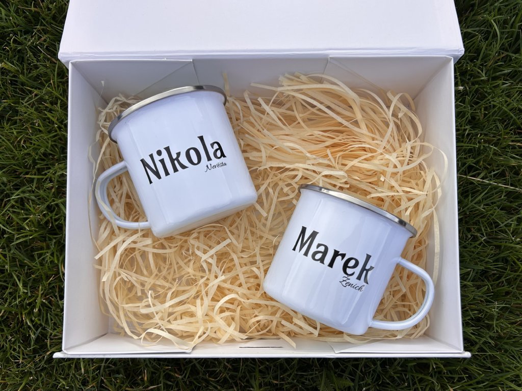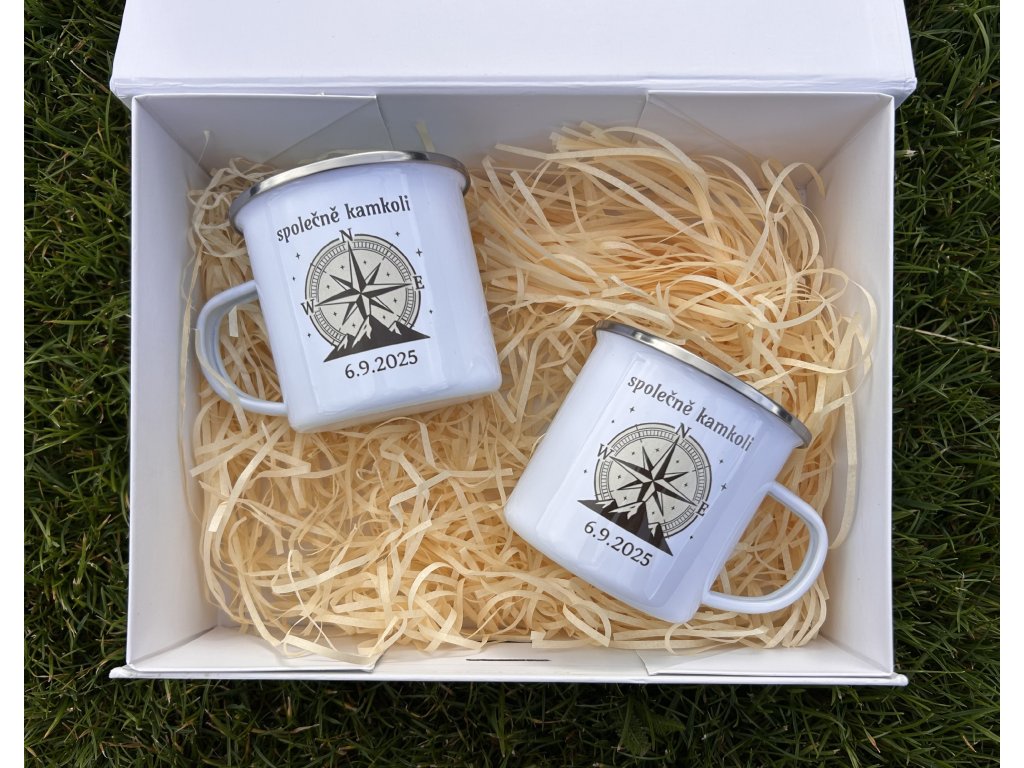 Originální sada dvou bílých smaltovaných hrníčků s potiskem kompasu a hor, doplněná nápisem „Společně kamkoli“ a datem dle vašeho přání.